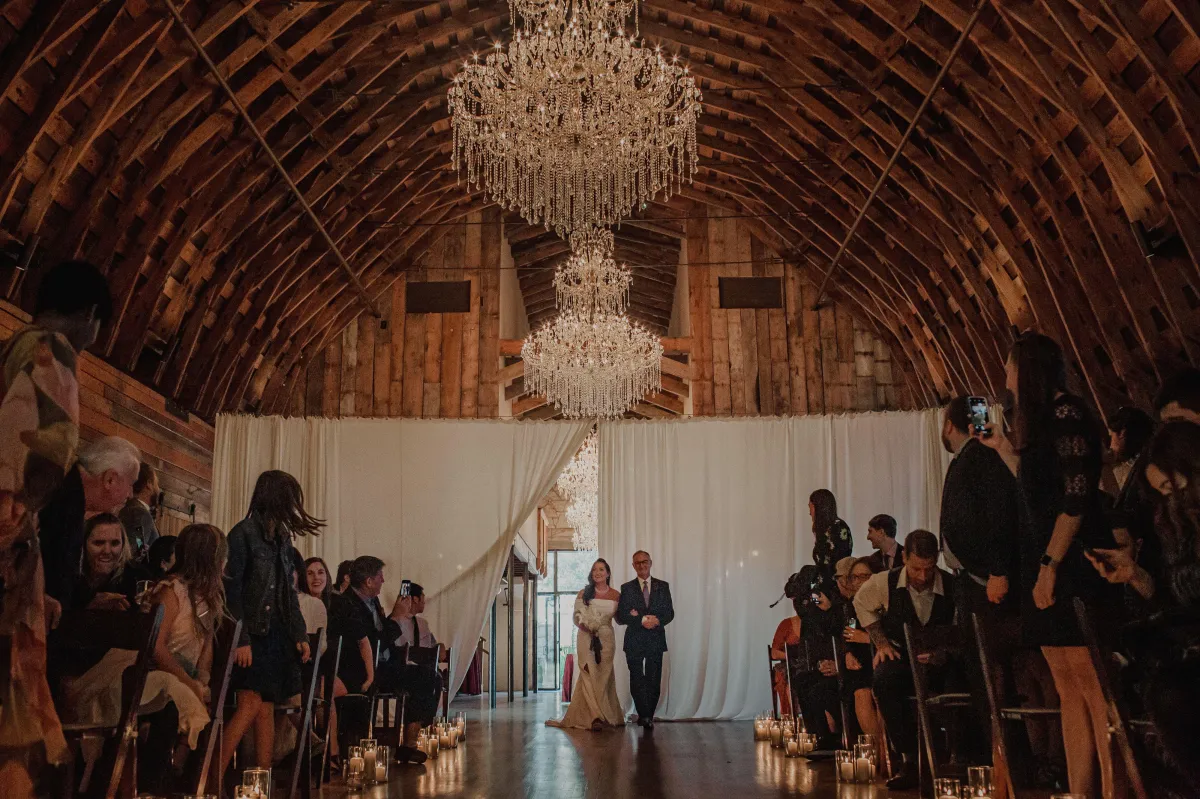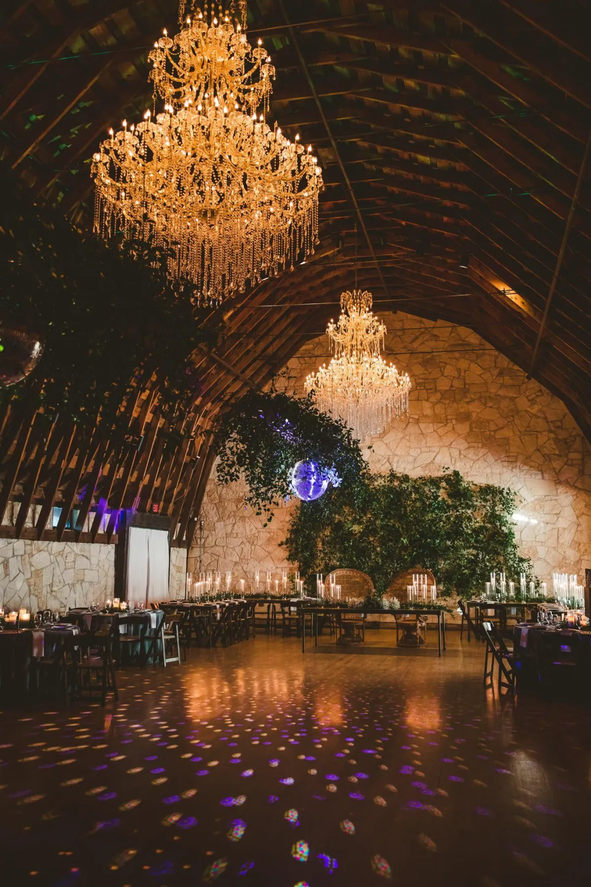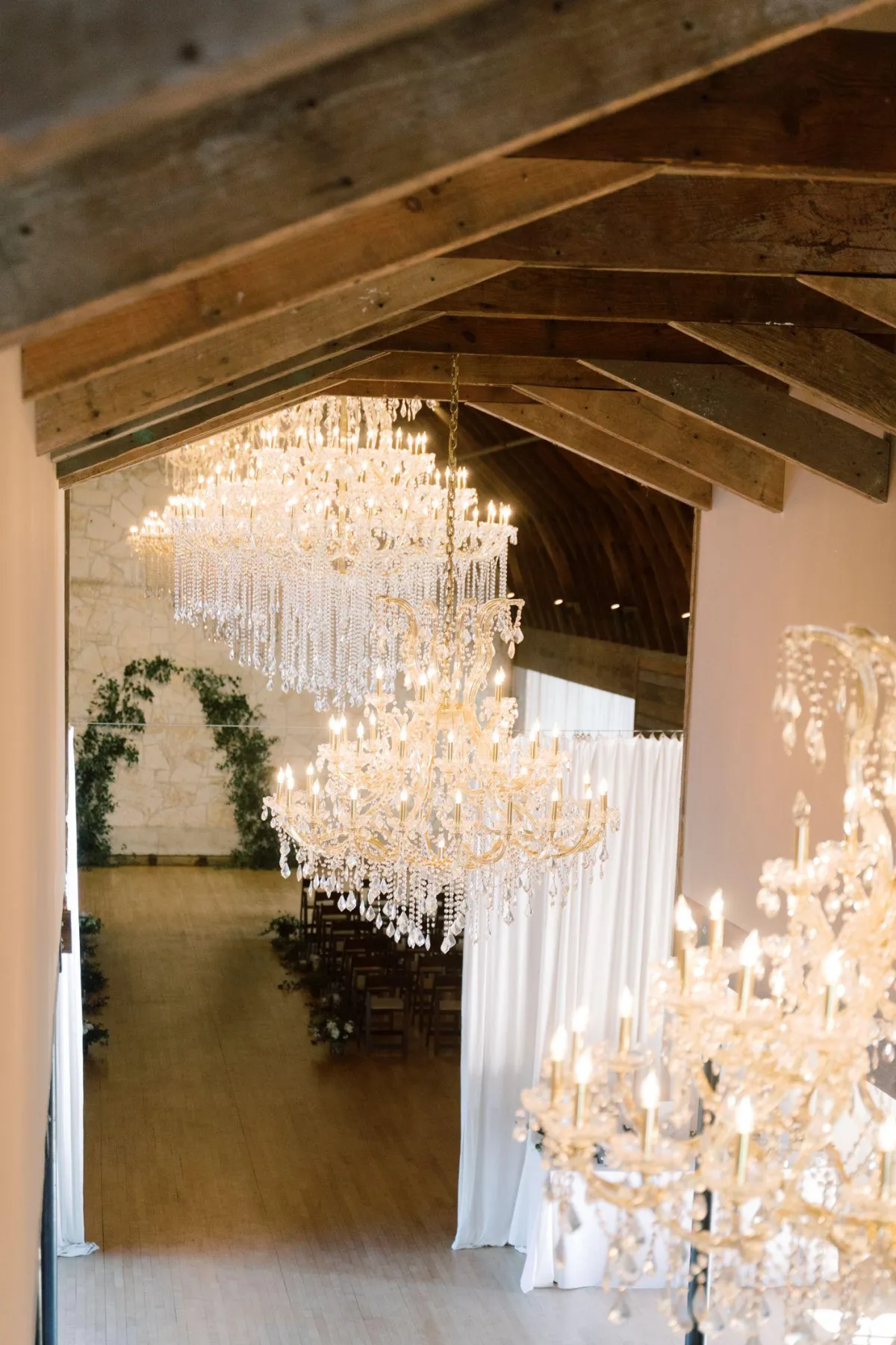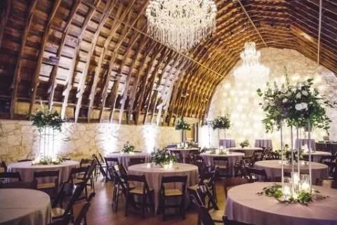 The grand wooden structure and six stunning crystal chandeliers create a spectacular setting. White draping adds a touch of softness to the barn, and natural elements of rich barn wood and white limestone combine to provide an impressive interior.