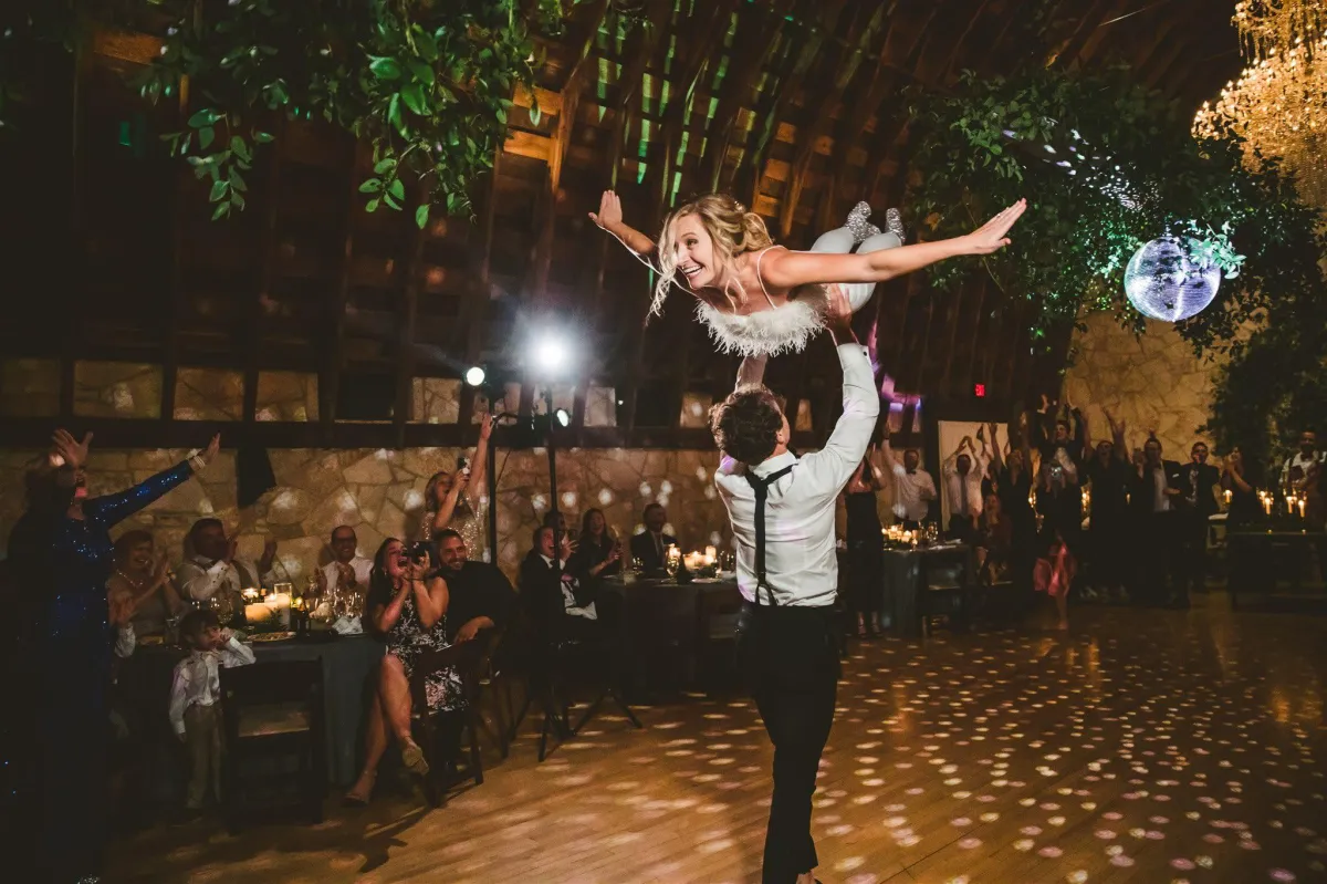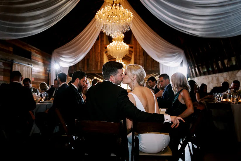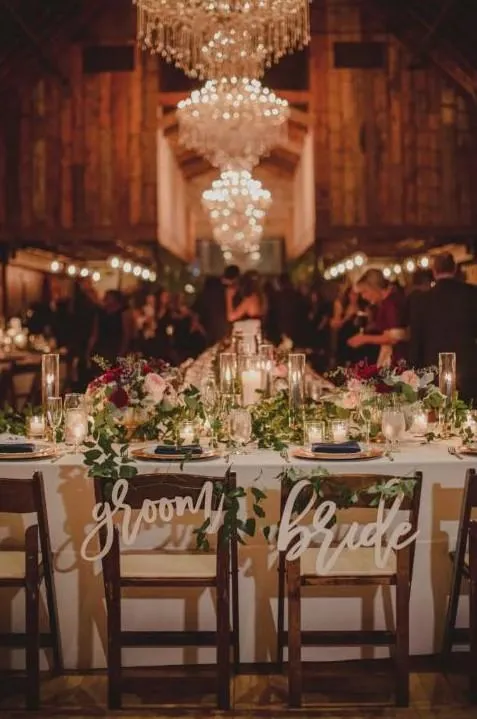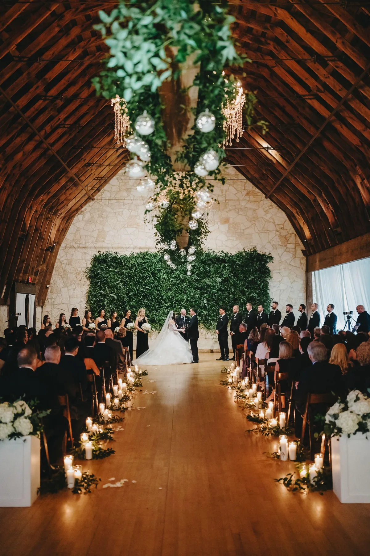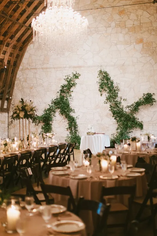 The grand wooden structure and six stunning crystal chandeliers create a spectacular setting. White draping adds a touch of softness to the barn, and natural elements of rich barn wood and white limestone combine to provide an impressive interior.